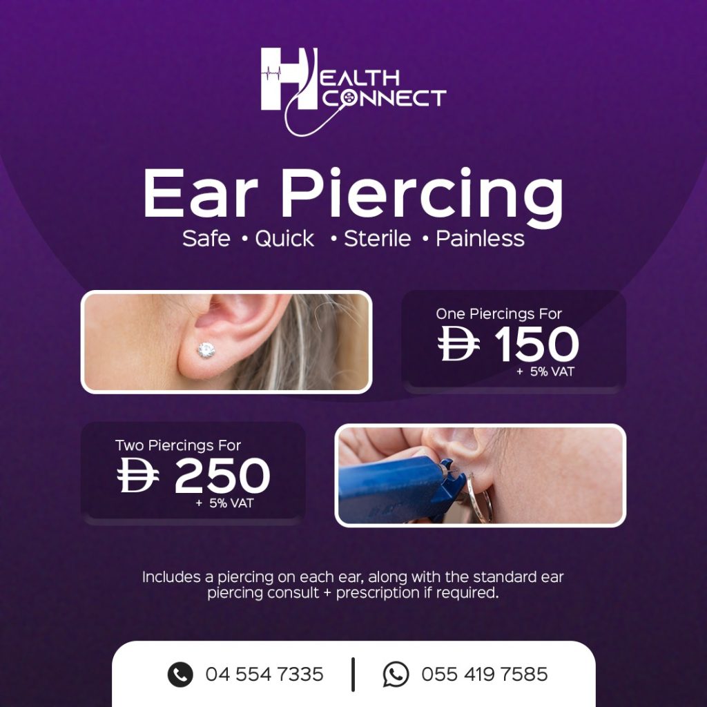 - Get expert medical-grade ear piercings at Health Connect Clinic, Dubai. Safe, quick, and stress-free for all ages, including newborns.